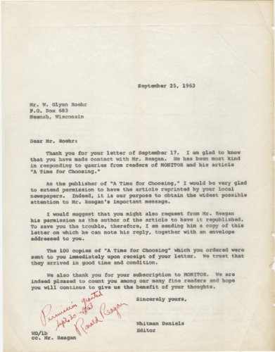Reagan gives permission to a resident of Neenah, Wisconsin, who wants his local newspapers to reprint "A Time for Choosing," a 1963 magazine article which developed into his 1964 Goldwater campaign speech known today as "The Speech" .
