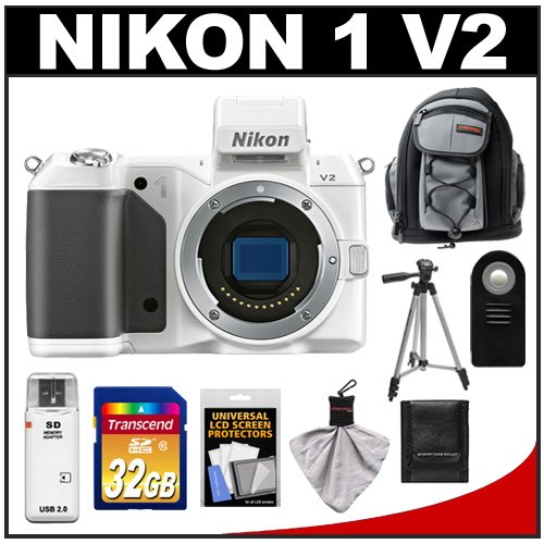 Nikon 1 V2 Digital Camera Body (White) with 32GB Card + Backpack + Tripod + Remote + Accessory Kit