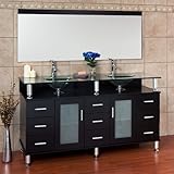 | ✚✚✚ 63" Halsten Double Sink Vanity Cabinet Offering abundant storage with several drawers and two cabinet doors, the 63 Halsten Double Sink Vanity Cabinet will be a functional yet stylish addition to your bathroom. The exposed basins of the integral sinks are a prominent feature on this large vanity and will make it a standout piece in your home. Made of laminated wood with an Espresso finish. Features two cabinet doors and nine drawers, all soft-close. Legs have built-in adjusters for use on uneven floors. Vanity set includes the vanity cabinet and a transparent tempered glass top with two integral sinks. Available with or without matching mirror. Brushed Aluminum hardware. Overall dimensions: 62-7/8 L x 21-7/8 W (front to back) x 34-3/8 H (± 1/2 ). Tempered glass top is 1/2 thick. Each basin measures: 14 diameter (± 1/2 ). Basins are 4-1/2 deep. Mirror overall dimensions: 63 L x 24-5/8 H. Top is pre-drilled with single faucet holes. Faucets and drains sold separately.