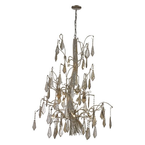 ELK Lighting Nimbus 14057/6+6+3 Chandelier - Antique Silver - 37W in. Size - 37W in.Fifteen lights arranged in three tiers provide plenty of illumination from the ELK Lighting Nimbus 14057/6+6+3 Chandelier - Antique Silver - 37W in., but its most striking feature is its beautiful, sculptural design. Featuring a central column created from intricate metal- and wire-work, this chandelier has silver leaf arms that support oversized, spear-shaped crystal accents. Hand-formed amber glass florets add a touch of color and extra dimension, and complement the antique silver finish. This chandelier uses 40-watt G9 bulbs (not included), and comes with chain for installation. Kichler Quality Since 1938, Cleveland-based Kichler Lighting has been known for their innovative designs and excellent craftsmanship. Kichler is the world's leading decorative lighting fixture company and the winner of four ARTS Lighting Manufacturer of the Year awards. Kichler designers travel the world to discover the latest trends in exterior and interior style, colors, and designs. They then translate the best of those trends into fixtures that will bring beauty, pleasure, and light into your home. Kichler fixtures stand the test of time and are functional works of art that you're sure to treasure. Please note this product does not ship to Pennsylvania. Transitional-styled 15-light chandelier in antique silver. Silver leaf arms display oversized spear-shaped crystal. Center column is formed of intricate metal and wire work. Enriched by hand formed amber glass florets. Chain-hung three-tier chandelier. Requires fifteen 40W G9 base bulbs(not included). Overall dimensions: 37W x 32H inches.